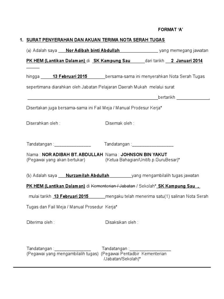 Surat penyerahan dan akuan terima nota serah tugas a Adalah saya Nurul binti Ismail yang memegang jawatan Pegawai Perkhidmatan Pendidikan di SMK Bawang Assan Sibu dari tarikh 7 Februari 2017 hingga 15 Oktober 2017 bersama-sama ini menyerahkan Nota Serah Tugas sepertimana diarahkan oleh Jabatan Perkhidmatan Awam melalui surat Bil.